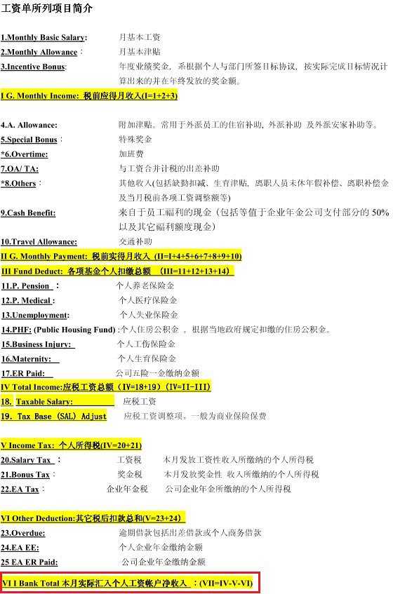 项的总合,即我们说的税前实得收入,也叫税前工资,即基本工资加上其余所有的补贴收入总和。最后部分我画红框的则是大家最熟悉的税后工资,每个月打到我们银行卡的数字。